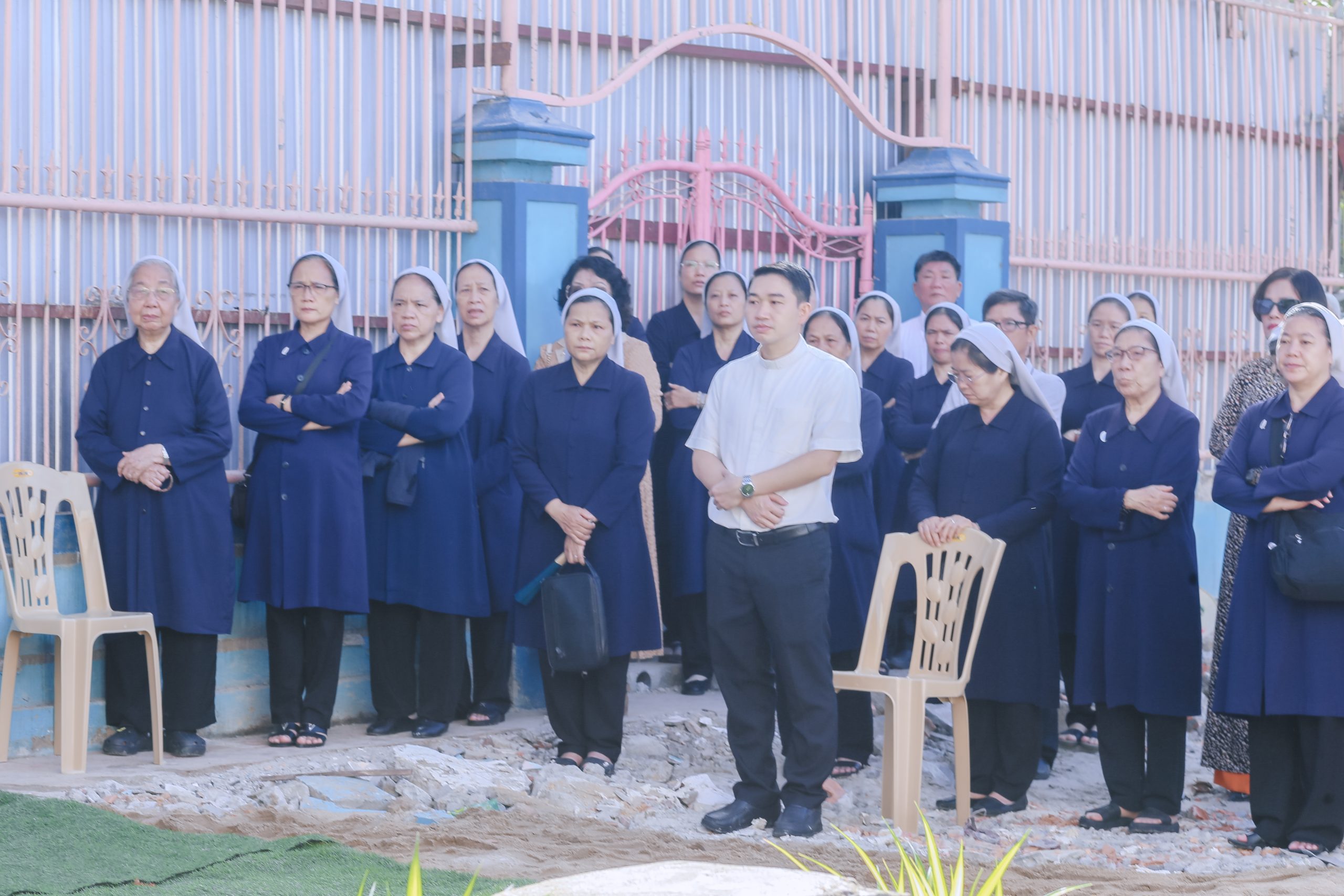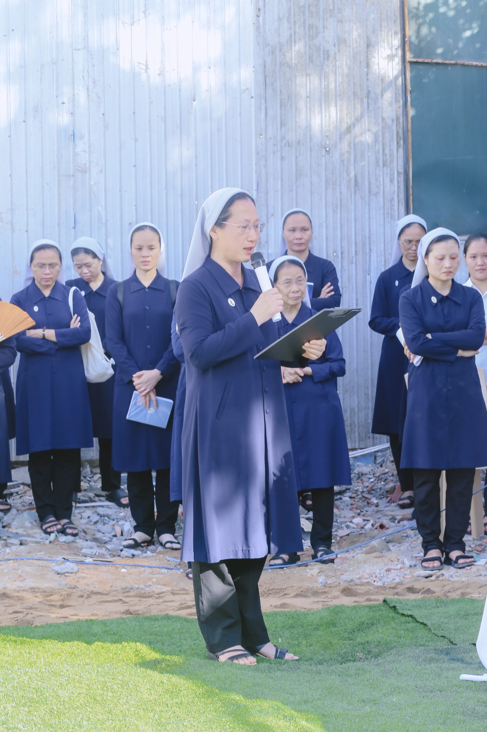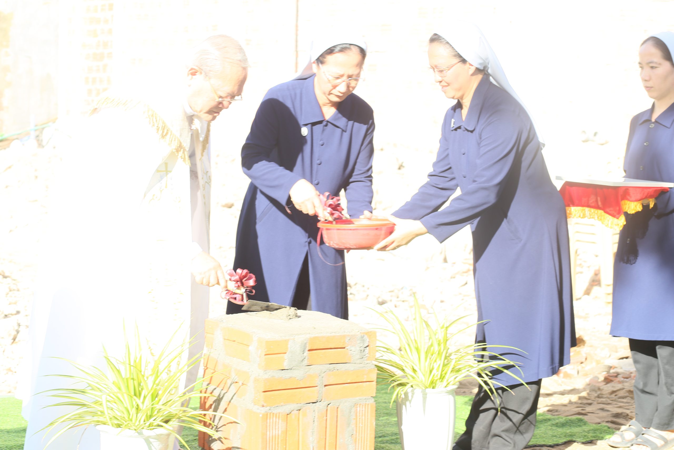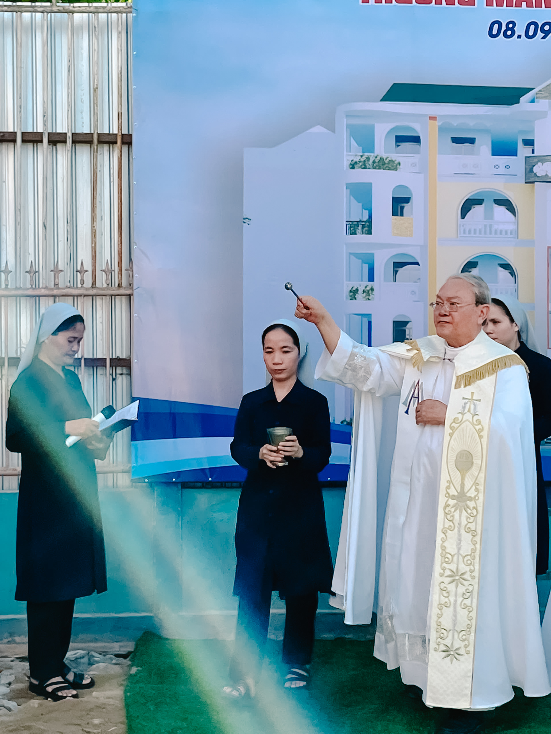 Tiếp đó, Cha chủ sự rảy nước phép thánh hóa khu đất và cùng với Chị Tổng Phụ trách thực hiện nghi thức đặt viên đá đầu tiên, khởi sự cho công trình xây dựng này.