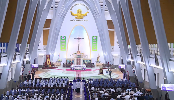 Trong tâm tình đó, vào lúc 15h ngày 02/11/2025, trong bầu không khí ấm áp, trang nghiêm và linh thiêng bao trùm khắp không gian tĩnh lặng của của ngôi Thánh đường Chính tòa Phủ Cam. Đức Tổng Giám mục Giuse Đặng Đức Ngân, tổng Giám mục tổng Giáo phận Huế, chủ sự Thánh lễ cầu nguyện cho các linh hồn đã qua đời, cách đặc biệt cầu nguyện cho các Đức Giám mục, Linh mục, Tu sĩ nam nữ, và giáo dân trong giáo phận. Cùng đồng tế với ngài có Đức Cha Phanxicô Xaviê Lê Văn Hồng – nguyên Tổng giám mục tổng Giáo phận, quý Đức ông Antôn, cha Tổng Đại diện, cha Đại diện giám mục, và đông đảo quý Cha trong giáo phận, nhất là sự hiện diện đầy tích cực, sốt mến của các nam nữ tu sĩ, chủng sinh và giáo dân. Điều này nói lên tinh thần hiệp nhất trong Hội thánh Chúa.