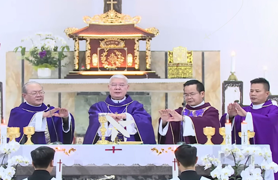 Sau Lời nguyện Hiệp lễ Đức Tổng giám mục Giuse, cùng với Đức Cha Phanxicô Xaviê, cha Tổng đại diện, và quý cha, đại diện cho toàn thể Dân Chúa Tổng giáo phận Huế dâng hương trước phần mộ của Đức Tổng Philipphê Nguyễn Kim Điền và di ảnh của Đấng Đáng kính Đức cố Hồng y Phanxicô Xaviê Nguyễn Văn Thuận để tưởng nhớ và tri ân.